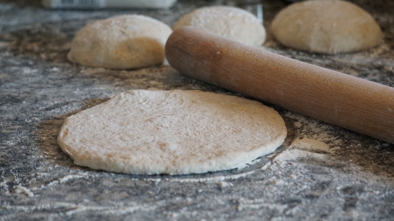 Skrab dejen ud på et meldrysset bord. Form den til en pølse og del den i 12 lige store stykker. Hvert stykke formes til en bolle, som hviler ca. 5-10 minutter inden den rulles til et fladt brød, ca. 3-5 mm tykt. Sørg for at dejen ikke hænger fast i bordpladen. Hvis dejen rives i stykker har den ikke lige så nemt ved at “boble op”. Placer brødene på bagepapir. Der kan være 4 pitabrød på ét stykke.